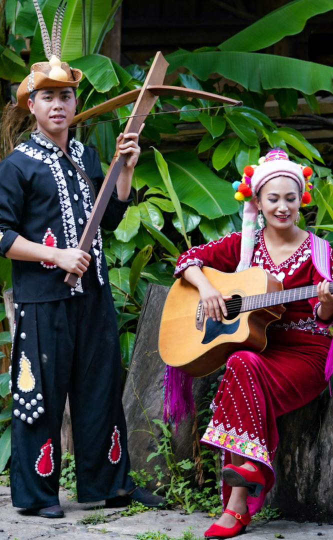 德昂族人口約1.7萬,主要分布在德宏州和保山市的潞西、梁河、瑞麗、隴川、隆陽等縣區(qū)。民居多為草排覆頂竹木結(jié)構(gòu)的干欄式建筑,眼前的德昂村建筑納入了能容納數(shù)十人居住的德昂大房子,氈帽頂?shù)男》孔樱€有頗具浪漫色彩的大公房、小公房……還建有“龍陽塔”標(biāo)志及佛教奘房、佛塔。德昂族民間普遍信奉南傳佛教,民俗活動(dòng)與佛事活動(dòng)關(guān)聯(lián)緊密。潑水節(jié)、開門節(jié)、關(guān)門節(jié)是重大節(jié)日。德昂族服飾色彩豐富,口頭文學(xué)特別是民歌創(chuàng)作活動(dòng)...